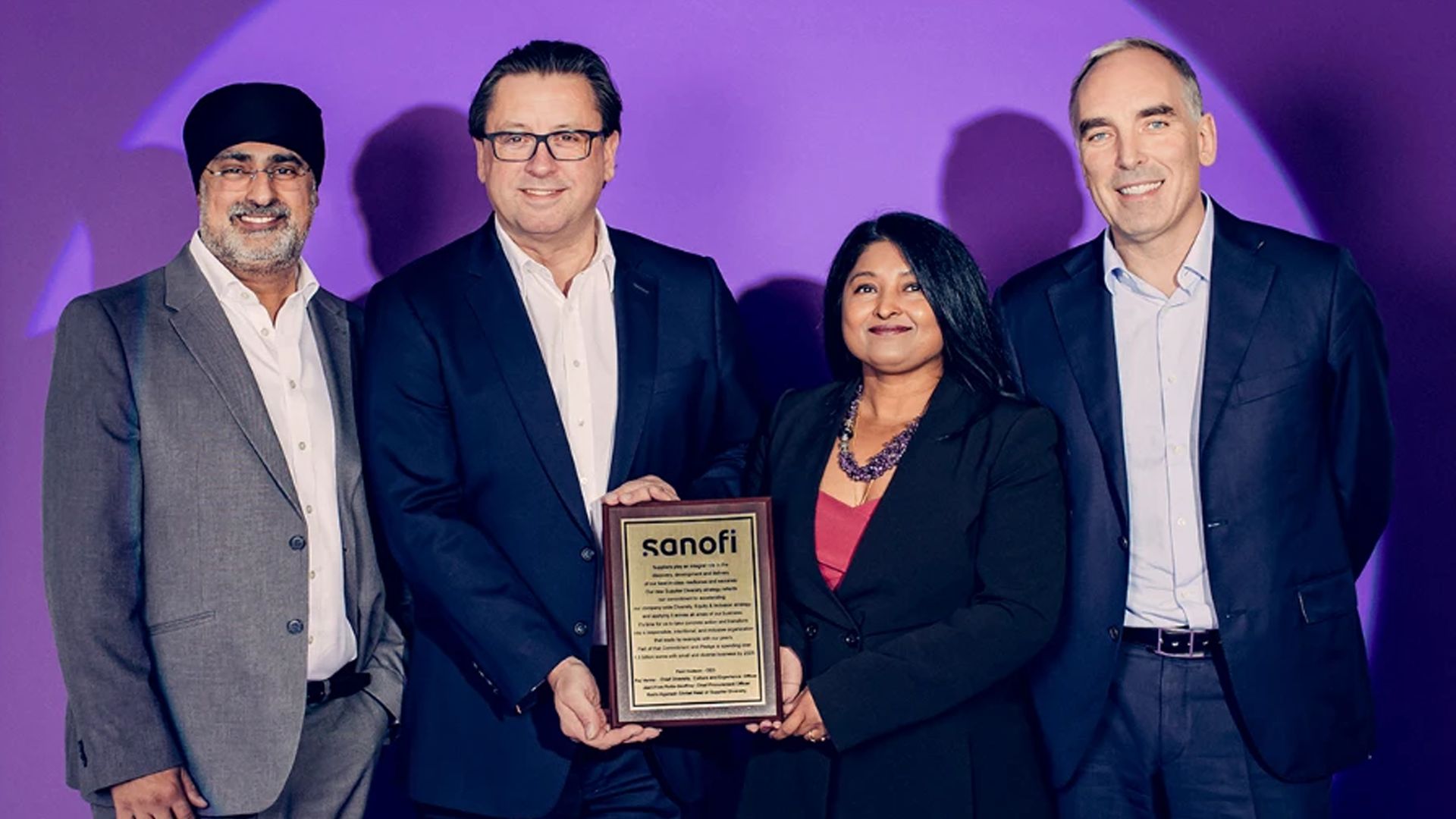 Raj Verma, Paul Hudson, Rakhi Agarwal, and Jean Yves Rotte Geoffroy present Sanofi’s pledge to Supplier Diversity